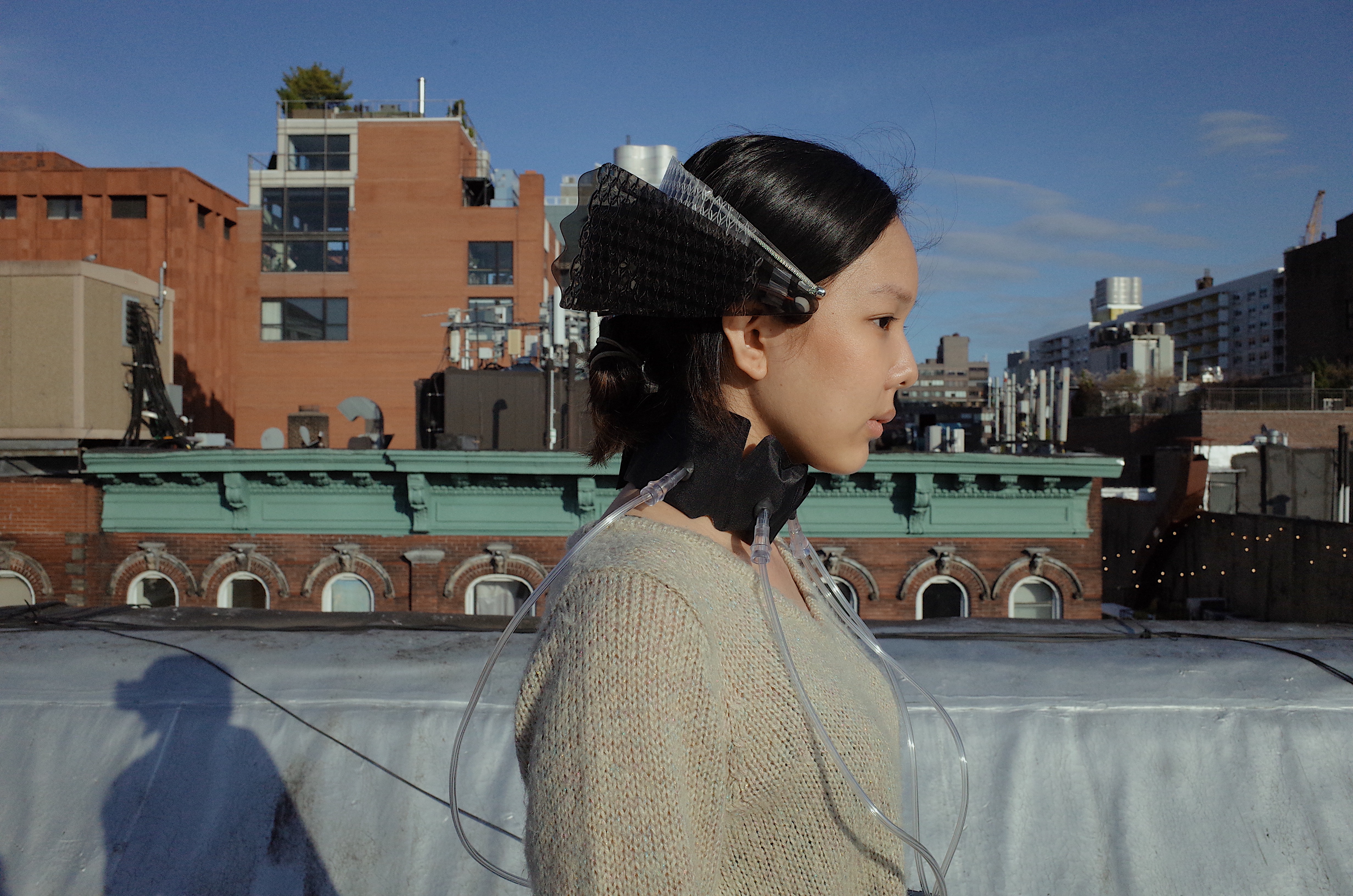 By providing vibrating feedback through bone conduction technology, artifact 01 is creating experience as if ones could feel their trembling heart beats with the rising index of air quaility.